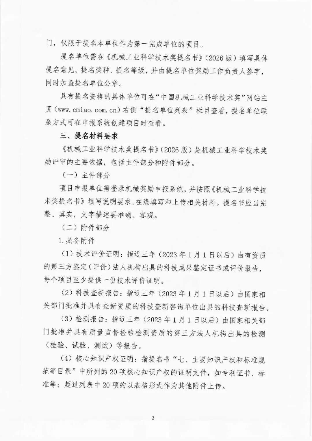 《关于开展2026年度“机械工业科学技术奖”提名工作的通知》